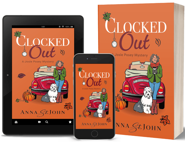 Clocked Out is book two in Anna St. John’s Josie Posey cozy mystery series, featuring retired investigative journalist Josie, her wonderful friends (the Mahjong Mavens), her handsome love interest, a curmudgeonly (in the best possible way) chief of police and most importantly, her darling Old English sheepdog Moe.