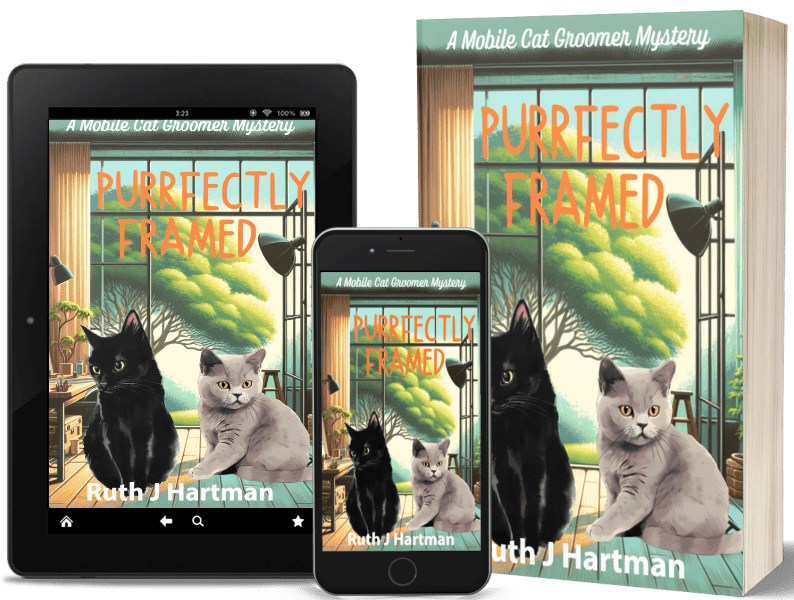 Welcome to my stop on the Great Escapes Virtual Book Tour for Purrfectly Framed (A Mobile Cat Groomer Mystery) by Ruth J. Hartman! Today we are featuring a review of the second book in this cozy mystery series. Stop by each blog on the tour for interviews, guest posts, spotlights, reviews, and more! It’s a great way to add books to your TBR! There is also a Rafflecopter Giveaway for this tour for an ebook copy of Purrfectly Framed.