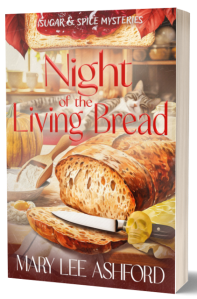 Welcome to my stop on the Great Escapes Virtual Book Tour for Night of the Living Bread (Sugar & Spice Mysteries) by Mary Lee Ashford! Today we are featuring a review of the fourth book in this delicious cozy mystery series. Stop by each blog on the tour for interviews, guest posts, spotlights, reviews, and more! There is also a Rafflecopter Giveaway for a gift basket with a signed copy of the book, a special recipe, a vintage community cookbook, and a pair of Cat Nap pajama pants, which are a part of the story. ENTER HERE!