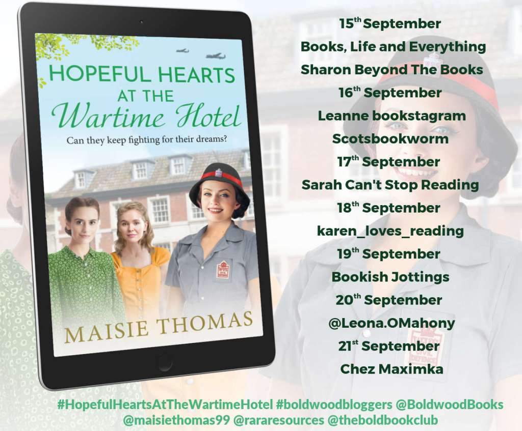 Welcome to my stop on Rachel’s Random Resources Book Tour for Hopeful Hearts at the Wartime Hotel by Maisie Thomas– ‘a wonderful and uplifting tale of female friendship’ (Eva Glyn, author of The Dubrovnik Book Club).