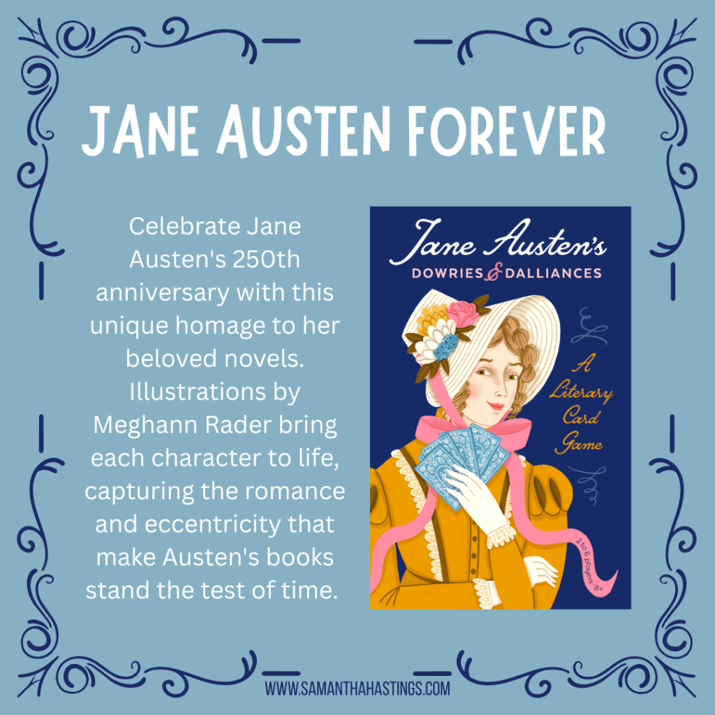 Welcome to my stop on the Great Escapes Virtual Title Blast for Jane Austen’s Dowries and Dalliances: A Literary Card Game from Samantha L. Hastings! Hours of fun for Jane Austen fans of all ages: This literary card game features simple and satisfying gameplay with a beautifully illustrated deck full of favorite characters from all of the novels. Don’t miss out on this gift perfect for: