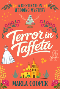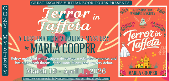Welcome to my stop on the Great Escapes Virtual Book Tour for Terror in Taffeta (Destination Wedding Mysteries) by Marla Cooper! Today we are featuring a review of book one in this cozy funny mystery series. Stop by each blog on the tour for interviews, guest posts, spotlights, reviews, and more! There is also a Giveaway for a price package that includes a paperback copy of the book! ENTER HERE!