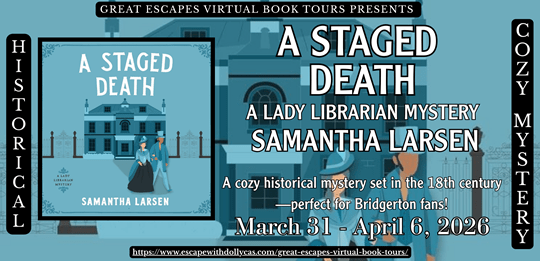 Welcome to my stop on the Great Escapes Virtual Book Tour for A Staged Death: Lady Librarian Mysteries by Samantha Larsen! Today we are featuring a review of the latest entry in this cozy historical mystery series. Stop by each blog on the tour for interviews, guest posts, spotlights, reviews, and more! There is also a giveaway for one audio code for A Staged Death. ENTER HERE!